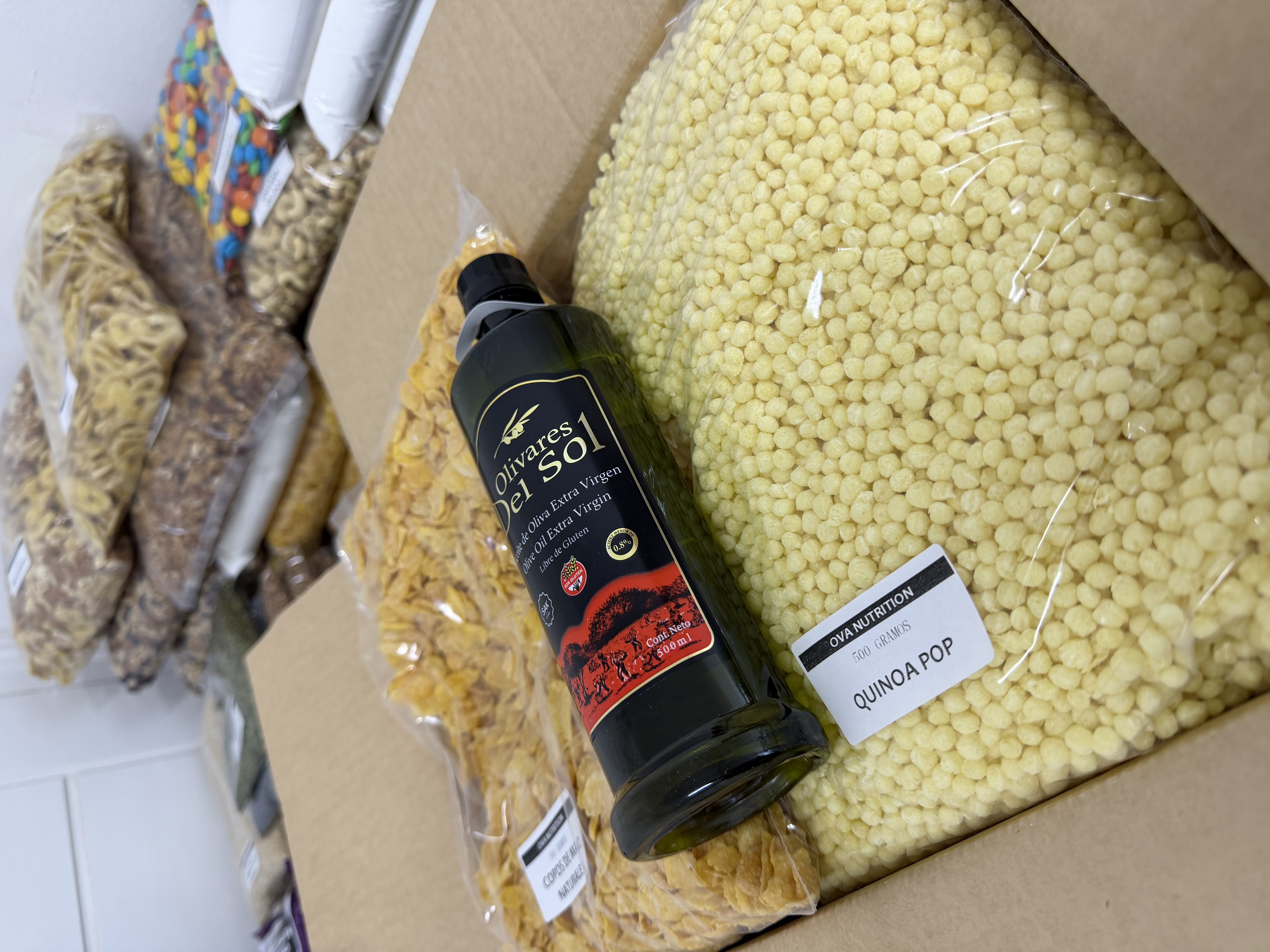 Contiene: 1kg mix con maní, 1kg granola golden, 1kg avena instantánea, 1kg harina integral, 1/2kg maní sin sal, 1/2kg gotitas águila semiamargo, 1/2kg arroz yamani integral, 1/4kg semilla de chía, 1/2kg quinoa pop, 1/2kg copos de mais naturales, 1 aceite de oliva extra virgen (11)